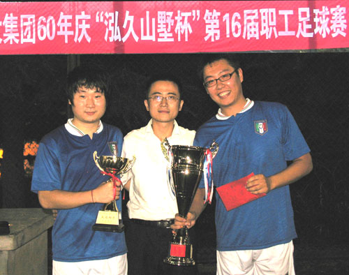 在隨后的閉幕式上,贊助單位“泓久山墅”項目代表——海廈置業(yè)銷售總監(jiān)高昂以及到場為球隊助威的二分公司總經理王曉超、六分公司總經理張啟亭等領導分別為獲得冠亞季軍的球隊及最佳射手頒獎。