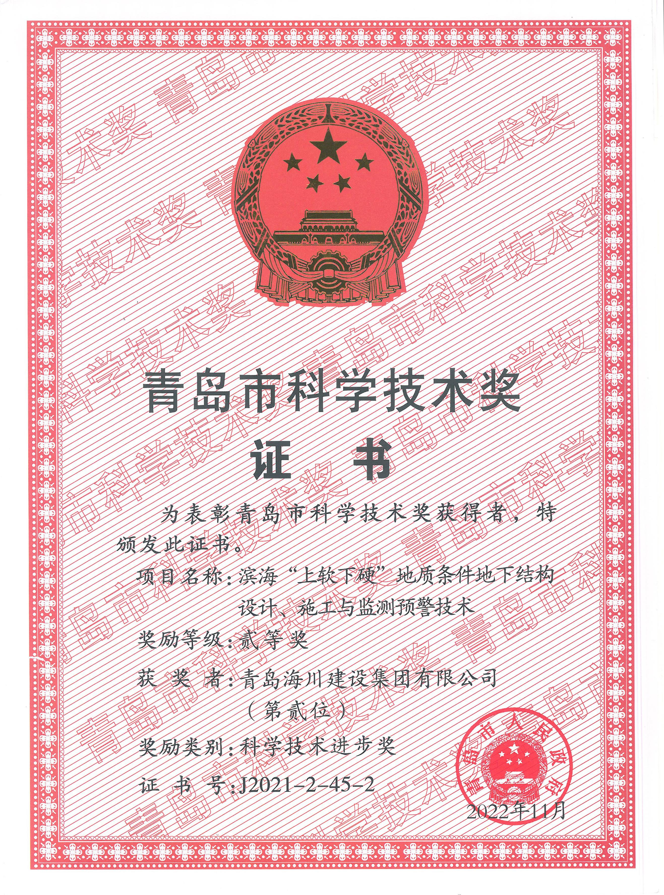 海川集團(tuán)榮獲青島市科學(xué)技術(shù)獎(jiǎng)2023-03-06近日,集團(tuán)公司領(lǐng)回了“青島市科學(xué)技術(shù)獎(jiǎng)”榮譽(yù)證書(shū)。經(jīng)青島市市科學(xué)技術(shù)獎(jiǎng)勵(lì)評(píng)審委員會(huì)評(píng)審、青島市市科學(xué)技術(shù)獎(jiǎng)勵(lì)委員會(huì)核定,市政府決定,由青島理工大學(xué)與青島海川建設(shè)集團(tuán)有限公司聯(lián)合申報(bào)的《濱海“上軟下硬”地質(zhì)條件地下結(jié)構(gòu)設(shè)計(jì)、施工與監(jiān)測(cè)預(yù)警技術(shù)》獲得科學(xué)技術(shù)進(jìn)步獎(jiǎng)二等獎(jiǎng)。課...