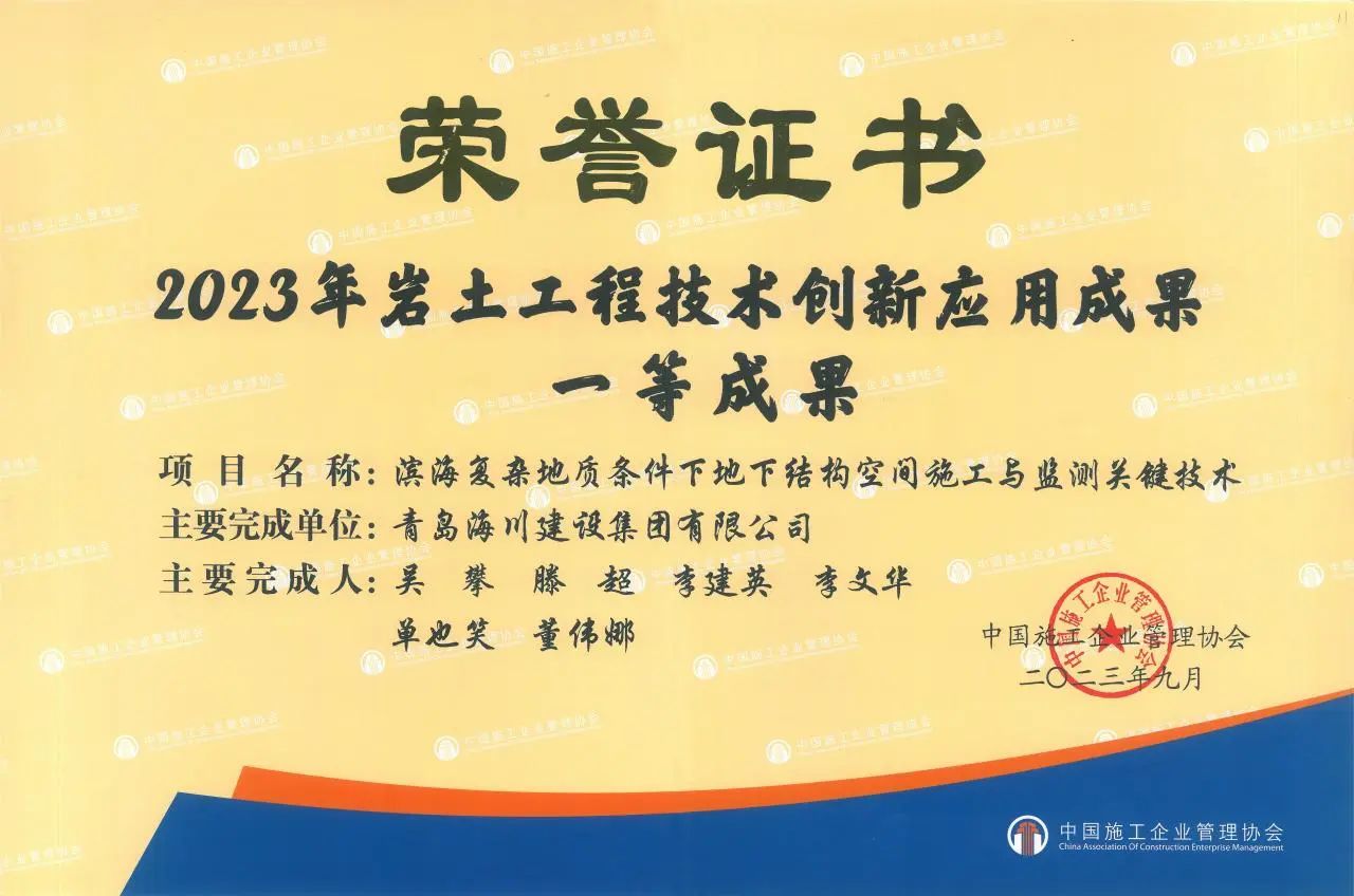 創(chuàng)新賦能 科技爭(zhēng)先 | 青島海川建設(shè)集團(tuán)榮獲多項(xiàng)科技成果獎(jiǎng)勵(lì)2023-10-08近日,中國(guó)施工企業(yè)管理協(xié)會(huì)公布了2023年度巖土工程技術(shù)創(chuàng)新應(yīng)用成果的通知,青島海川建設(shè)集團(tuán)研究課題《濱海復(fù)雜地質(zhì)條件下地下結(jié)構(gòu)空間施工與監(jiān)測(cè)關(guān)鍵技術(shù)》榮獲一等成果,該成果為集團(tuán)公司首次獲此殊榮,也是本年度青島市唯一一等獎(jiǎng)獲獎(jiǎng)獎(jiǎng)項(xiàng)。近年來(lái),海川建設(shè)始終堅(jiān)持以科技為本,以...