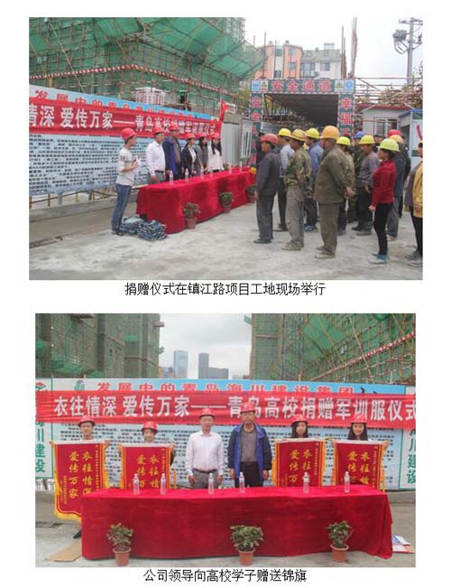 10月16日下午,由青島理工大學(xué)土木學(xué)院學(xué)生會牽頭組織,青島大學(xué)和中國海洋大學(xué)共同參加的“衣往情深,愛傳萬家”軍訓(xùn)服捐贈儀式,在青島海川建設(shè)集團鎮(zhèn)江路項目工地隆重舉行。來自青島理工大學(xué)市北校區(qū)、黃島校區(qū),青島大學(xué)和中國海洋大學(xué)的學(xué)生組織代表出席了捐贈儀式,青島海川建設(shè)集團副總裁李尊強、團委書記王群、六分公司都市逸品項目部經(jīng)理劉峰官以及所在項目部分工人代表出席了捐贈儀式。