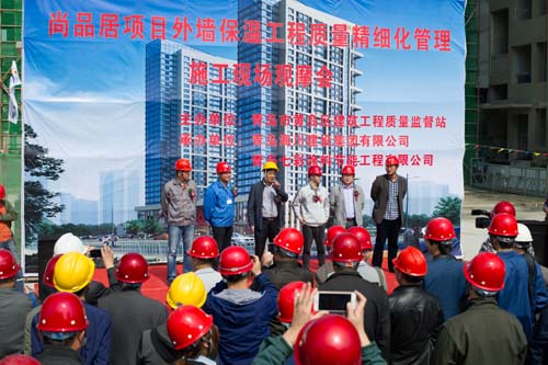 觀摩會當天,集團副總裁馬志驍、七分公司總經(jīng)理朱超等陪同黃島區(qū)質(zhì)監(jiān)站領(lǐng)導(dǎo)進行了現(xiàn)場觀摩,上午9:00黃島區(qū)質(zhì)監(jiān)站領(lǐng)導(dǎo)主持了現(xiàn)場觀摩會,對照實體樣板詳細講解保溫工程各工序質(zhì)量保證要點。主要就工程實體保溫工程界面劑噴涂、玻纖網(wǎng)粘貼、加強層粘貼、窗洞口巖棉套割、錨栓固定等施工工藝進行了講解并宣布現(xiàn)場觀摩開始。黃島區(qū)各與會單位人員現(xiàn)場觀摩了實體工序樣板,各單位間相互切磋工藝做法,交流標準化管理經(jīng)驗。上午11:00觀摩人員陸續(xù)離開施工現(xiàn)場,現(xiàn)場觀摩會圓滿結(jié)束。