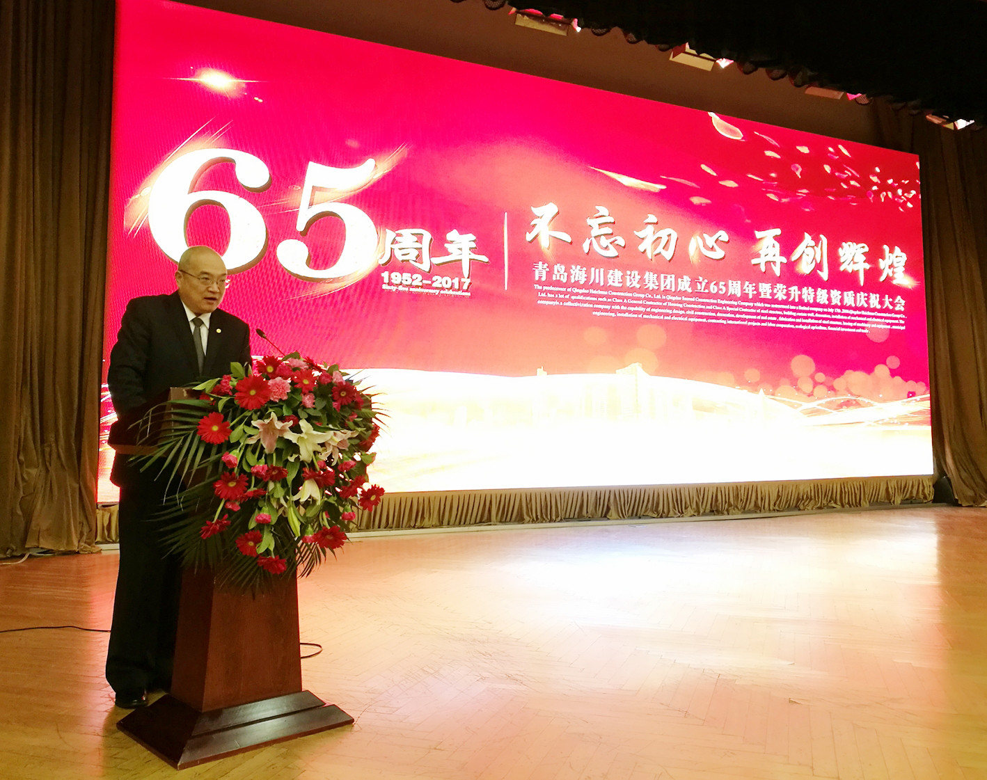 2017年12月29日上午,青島海川建設集團成立65周年暨榮升特級資質(zhì)慶祝大會在黃海飯店隆重舉行。蒞臨現(xiàn)場的嘉賓有:原二建公司經(jīng)理陳樹業(yè)、原二建公司經(jīng)理國常光、原二建公司經(jīng)理鄭同慶,青島建設集團建興工程有限公司董事長逄振輝、青建隆泰興業(yè)建設有限公司總經(jīng)理趙錫業(yè)、青島建設裝飾集團有限公司董事長張波等領導。海川建設集團董事長吳鑫、總裁仇建軍和公司股東、理事會成員、企業(yè)中層管理人員200余人參加,共同見證海川建設集團在改革奮進歷程當中砥礪前行的輝煌成果。